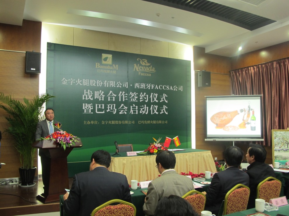 西班牙FACCSA公司負(fù)責(zé)人拉蒙先生在致辭中表示,發(fā)酵火腿在中國有巨大的市場空間,巴瑪火腿是中國發(fā)酵火腿的領(lǐng)軍品牌。雙方建立戰(zhàn)略合作關(guān)系,是企業(yè)發(fā)展需要,也是優(yōu)勢互補(bǔ)的最佳選擇。今后,雙方要整合資源,加強(qiáng)交流,深化合作,努力把兩個(gè)企業(yè)的合作打造成中西兩國經(jīng)貿(mào)合作的典范。