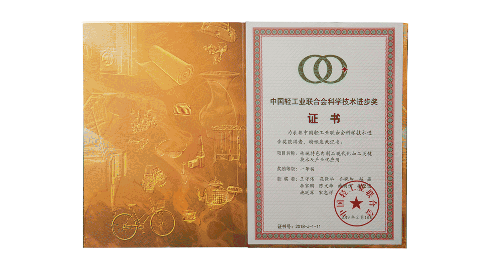 日前,中國輕工業(yè)聯(lián)合會對2018年度在科技發(fā)明及技術(shù)創(chuàng)新方面表現(xiàn)突出的企業(yè)及項目進行了表彰,由金字參與的“傳統(tǒng)特色肉制品現(xiàn)代化加工關(guān)鍵技術(shù)及產(chǎn)業(yè)化應用”項目經(jīng)審定及批準,喜獲中國輕工業(yè)聯(lián)合會科技進步獎一等獎。